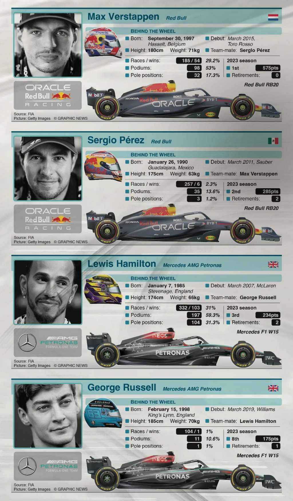 Graphics showing details of all 20 drivers contesting the 75th Formula One World Championship in 2024. Dutch driver Max Verstappen will again be racing for Red Bull Racing, after securing his third world title in the 2023 Championship with 575 points.